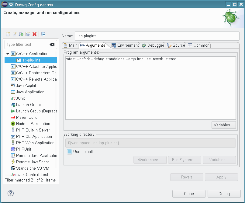 Now we can edit configuration by selecting Run → Debug Configurations... and pass additional parameters to unit testing subsystem. Select the generated lsp-plugins debug profile, Arguments tab and enter testing subsystem command-line arguments. For example, the following: