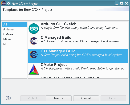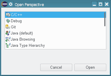 Now we can switch to C++ development perspective by selecting Window → Perspective → Open Perspective → Other...