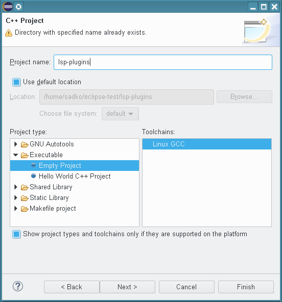 Enter the folder name same to the folder of the GIT repository, select Executable → Empty Project, Linux GCC, then click Finish