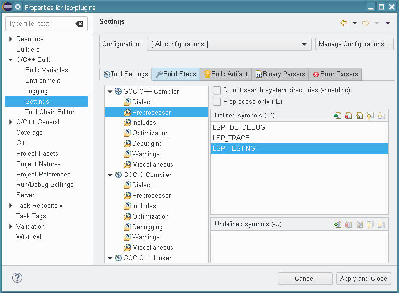 Select GCC C++ Compiler → Preprocessor section and add following macros to Defined Symbols: