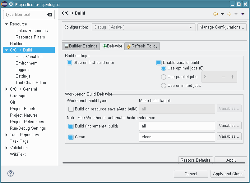 To optimize build, we can enable more than one thread for build. For this purpose, select C/C++ Build → Behavior and click Enable Parallel Build, Use optimal jobs: