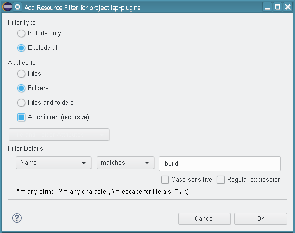 Set Filter type to Exclude all, Applies to - Folders, All children (recursive), Name Matches .build. The result should look like: