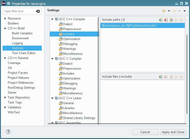 Now we need to define additional location of header files. Select GCC C++ Compiler → Includes and add to the Include paths the following line: