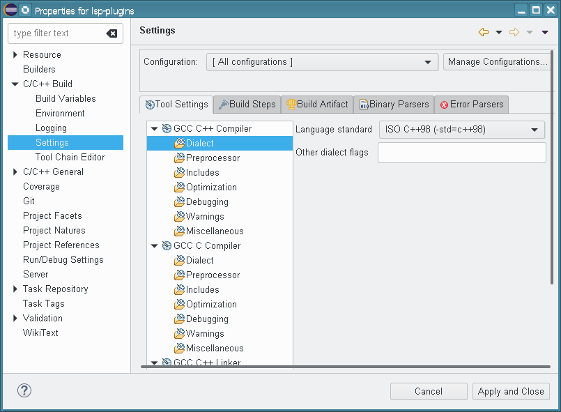Select GCC C++ Compiler → Dialect section and select the ISO C++98 as a Language Standard: