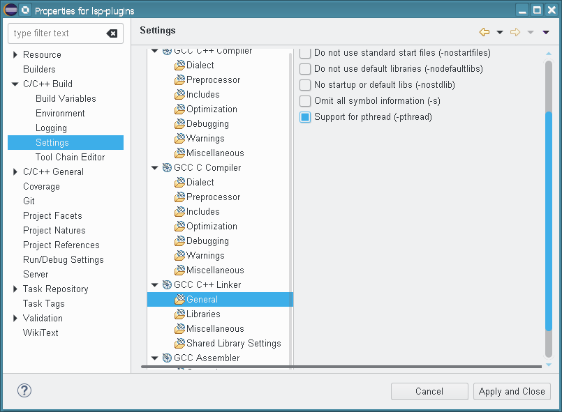 Select GCC C++ Linker → General settings and enable the Support for pthread (-pthread) option: