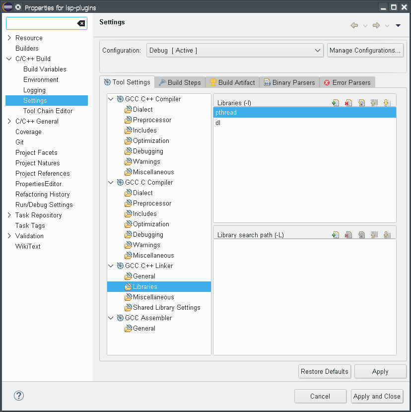 Select GCC C++ Linker → Libraries settings and add the following libraries to the list: