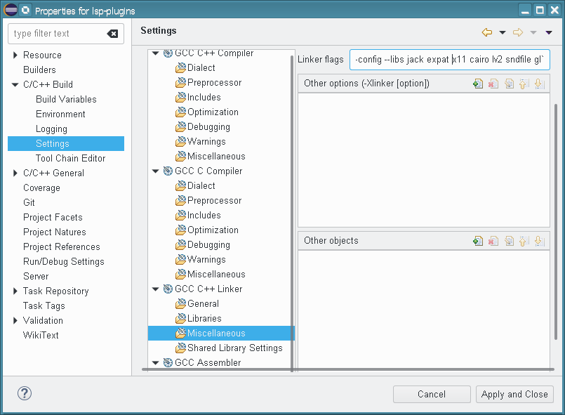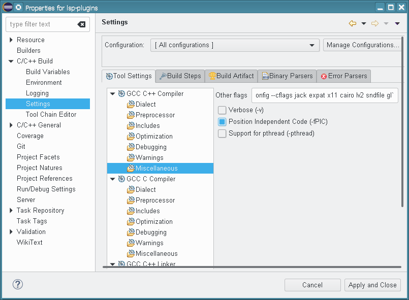 Now we need to enable extra headers for additional packages, for this purpose visit GCC C++ Compiler → Miscellaneous and enter into the Other flags field the following string:
